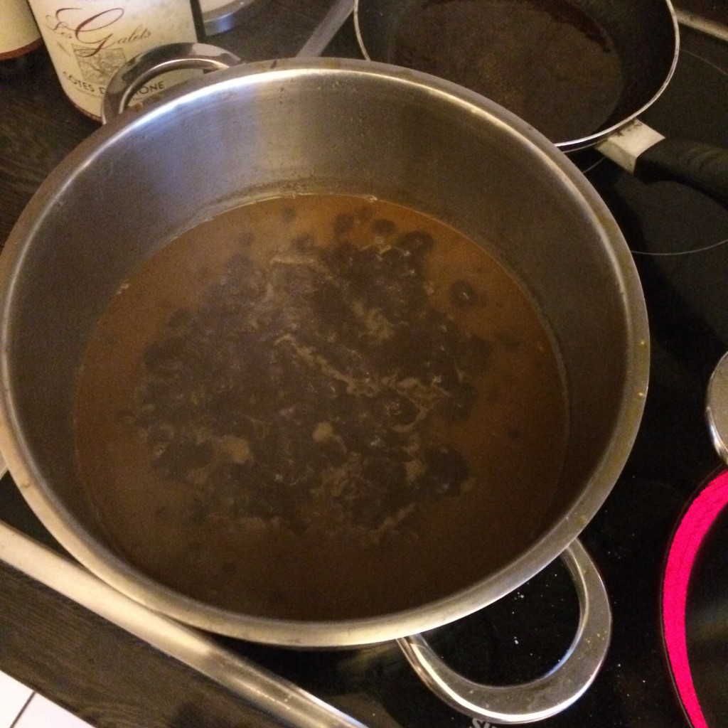 8.) Entnehmt nun die Haxe und passiert die Sosse durch ein Sieb. Das Knochenmark nicht vergessen, schön den Knochen ausblasen! Jetzt stellt sich die richtige Struktur der Sosse her. Wir reduzieren diese noch und kochen sie etwas ein, bis die Konsistenz wieder sirupartig ist.
