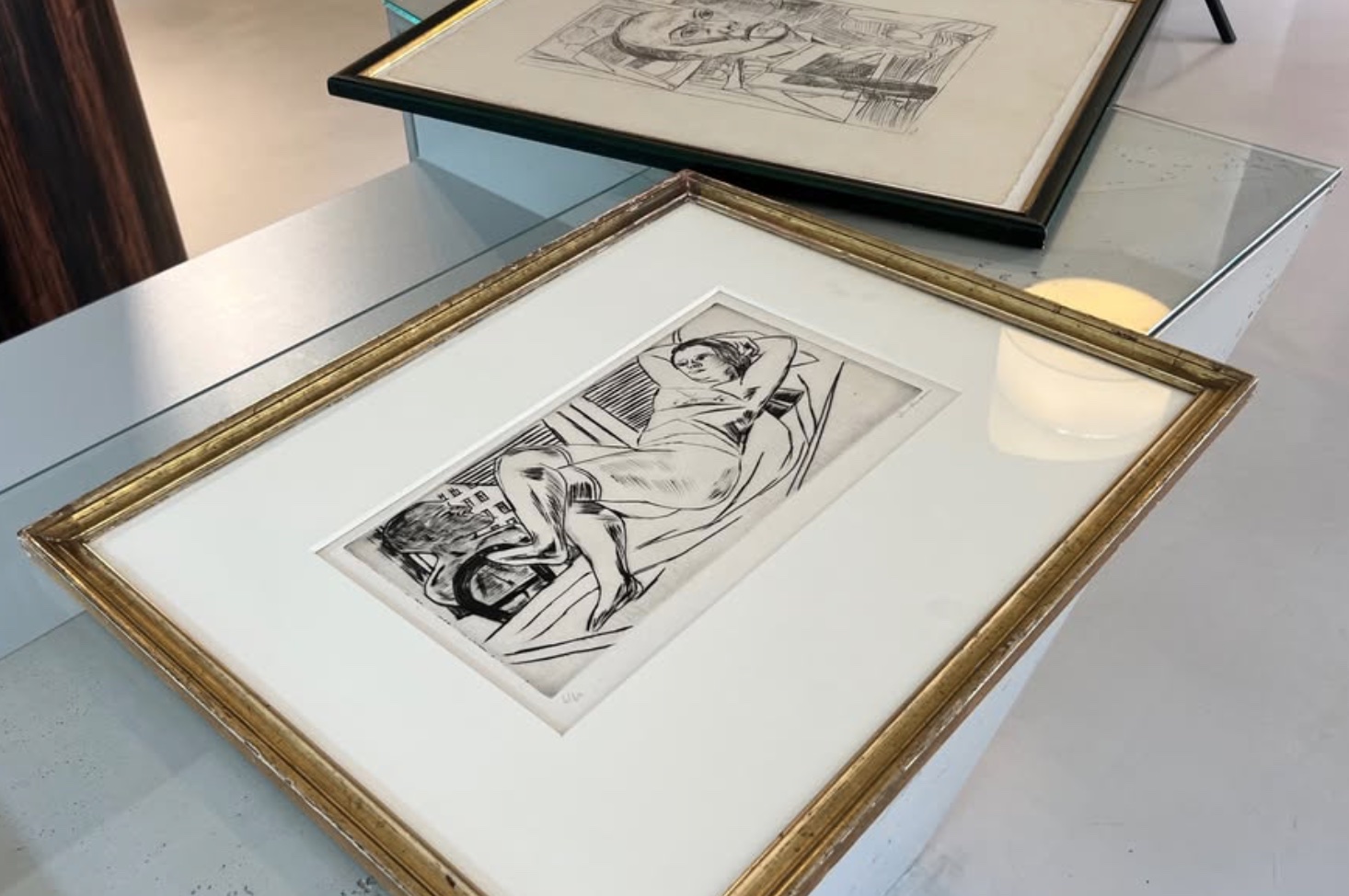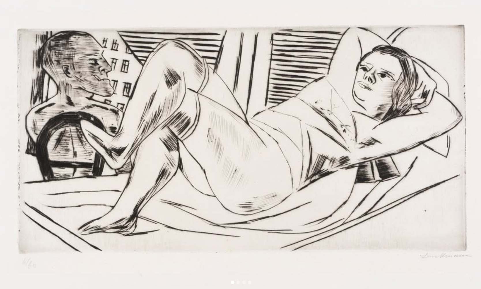 This is a very expressive etching with concise lines. The man in the background, Beckmann himself, makes the setting special. The context is clear. Early afternoon, erotic posing by Minna Beckmann-Tube (1881-1964), no pictoral masturbation, Beckmann smoking next to the window. Despite being connected for the rest of their lives, Beckmann and Minna were technically married, but not a couple living together. Minna stayed in Berlin with Peter, their son, Beckmann worked and lived in Frankfurt. Beckmann painted the same scene one year later in oil (1924, Göpel 353, Mayen Beckmann Archive), showing the protagonists in a much more tender version and he did not depict the raw sexuality that is in this etching, Beckmann almost like an animal. Hence Beckmann overpainted Minna’s head in the oil painting with the features of his second wife, Quappi (Mathilde) Beckmann (1904–1986).